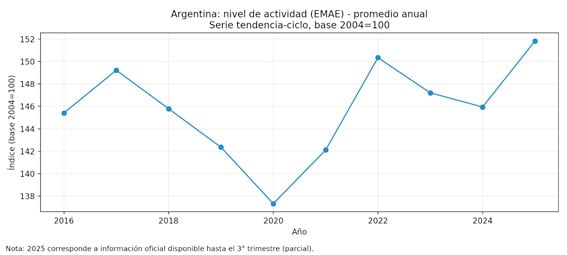 Antes de avanzar, una aclaración metodológica necesaria: al día de hoy, el último dato oficial de cuentas nacionales del INDEC corresponde al 3° trimestre de 2025. Por eso, cuando hablamos de “cómo cerró 2025”, combinamos: lo que muestran las cuentas nacionales hasta el 3T, los indicadores de actividad del final de año (EMAE), y el cierre completo del comercio exterior (enero–diciembre).